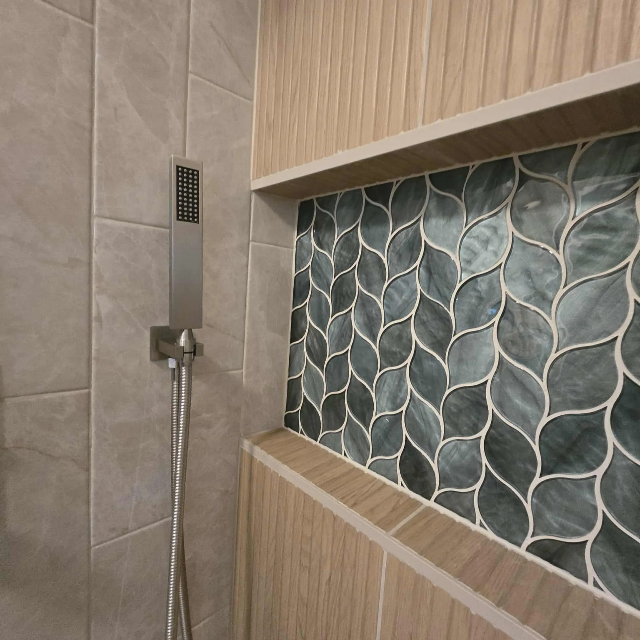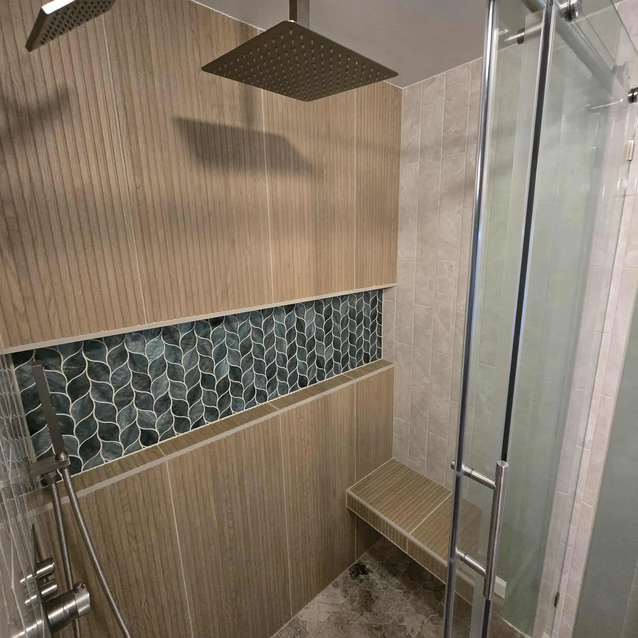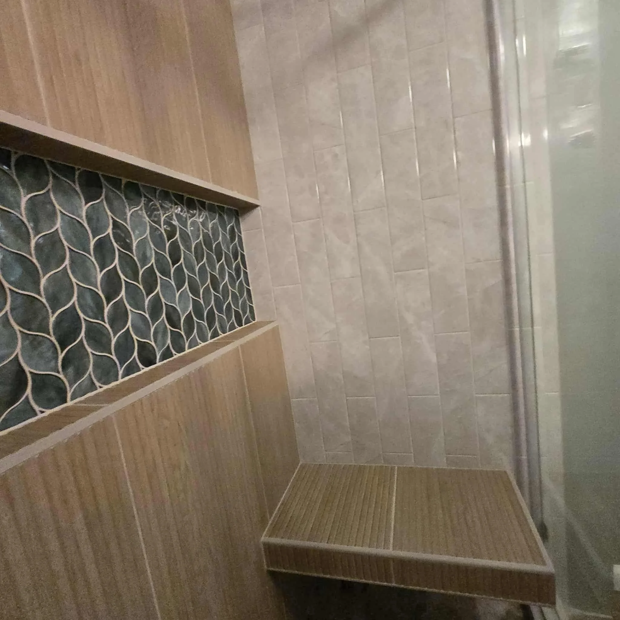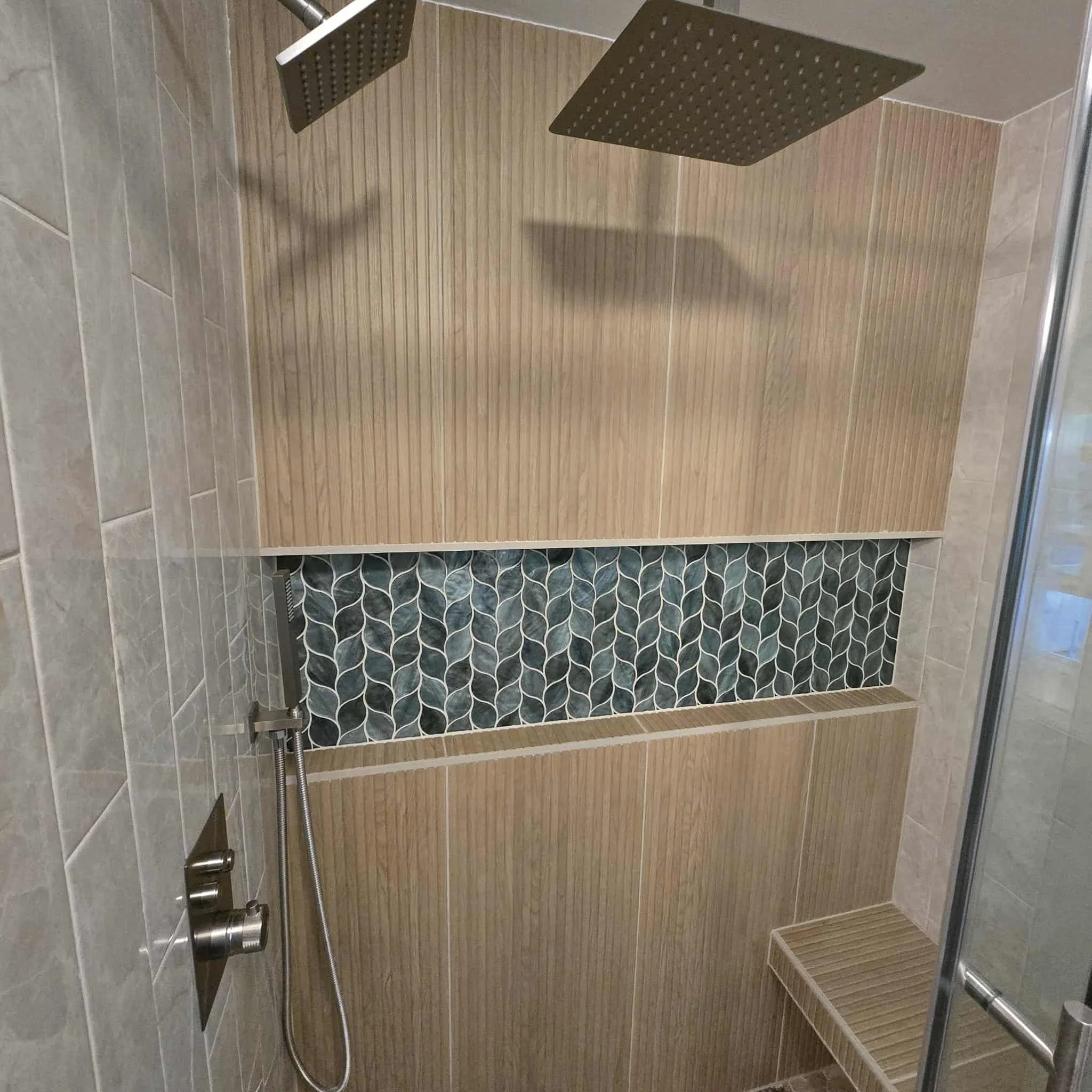 This shower was as challenging as it is beautiful. What started as a quick DIY before a house flip, turned into an elegant jungle themed walk in shower. upon demo, we found multiple issues typically found in a quick DIY. We safely buttoned up all the existing issues, and played off the earth tones in the bathroom, to bring this jungle shower to life, and to be enjoyed for many years to come
