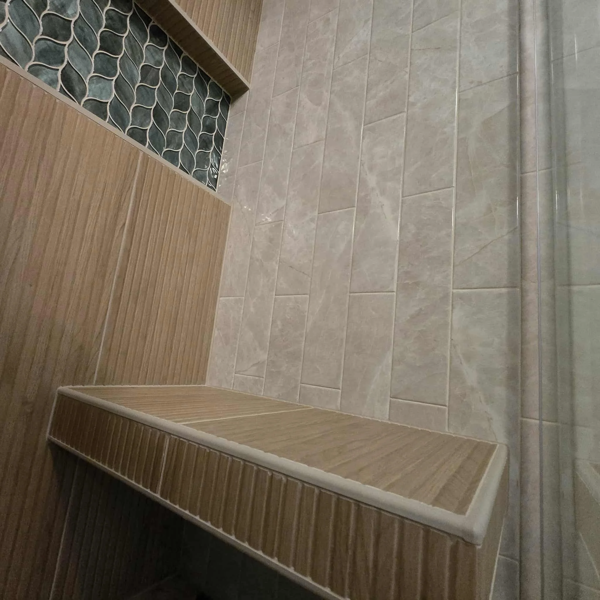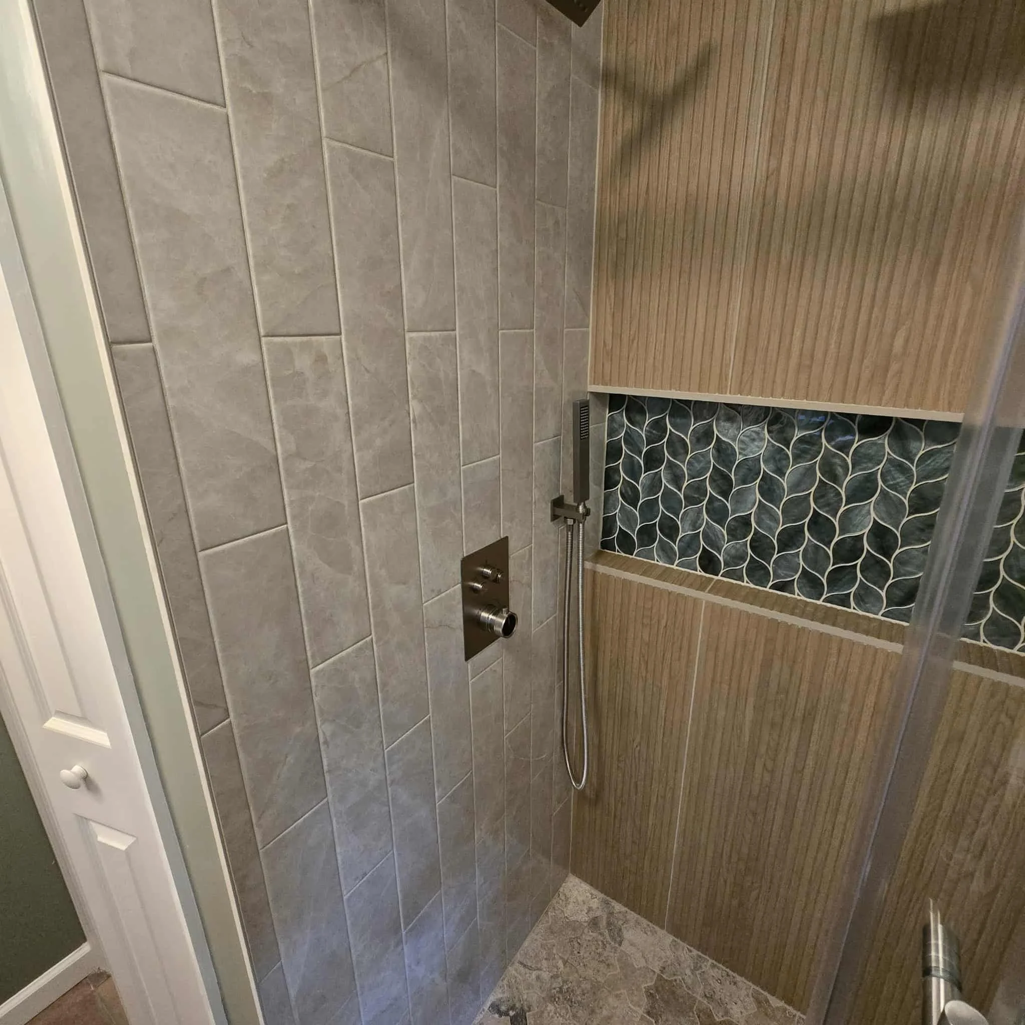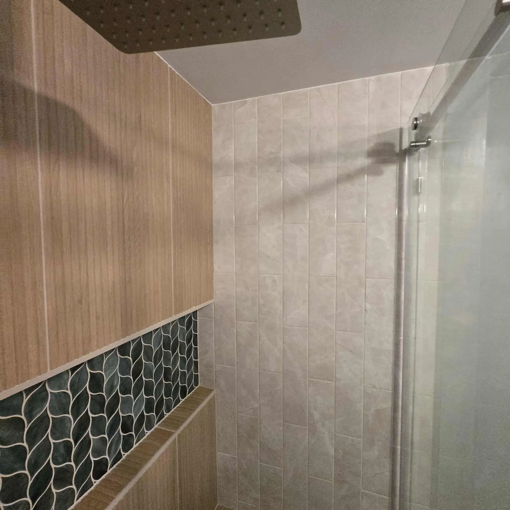 This shower was as challenging as it is beautiful. What started as a quick DIY before a house flip, turned into an elegant jungle themed walk in shower. upon demo, we found multiple issues typically found in a quick DIY. We safely buttoned up all the existing issues, and played off the earth tones in the bathroom, to bring this jungle shower to life, and to be enjoyed for many years to come
